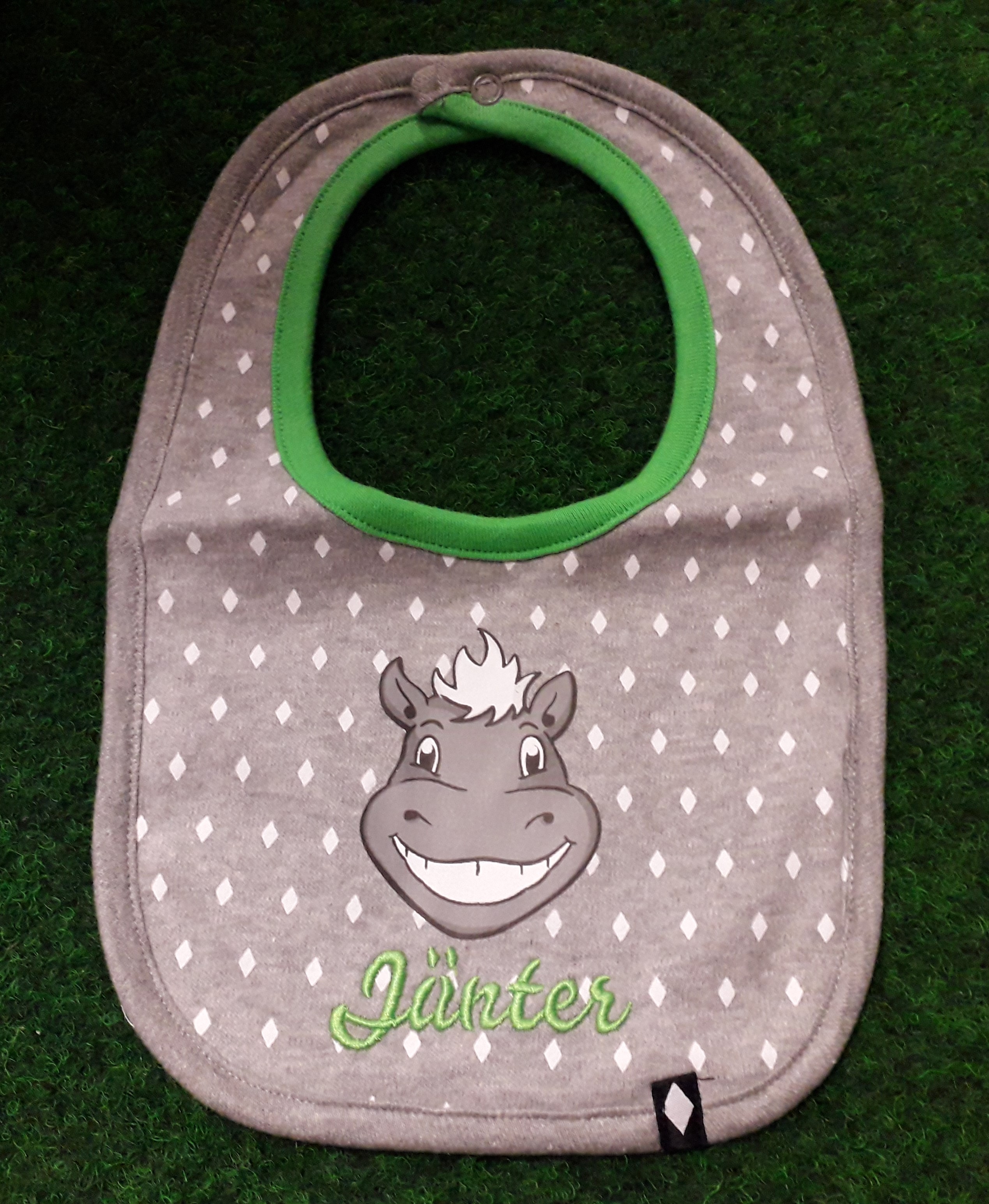 Das grün-graue Lätzchen trägt die Aufschrift "Jünter" und das Maskottchen mittig auf der Vorderseite.