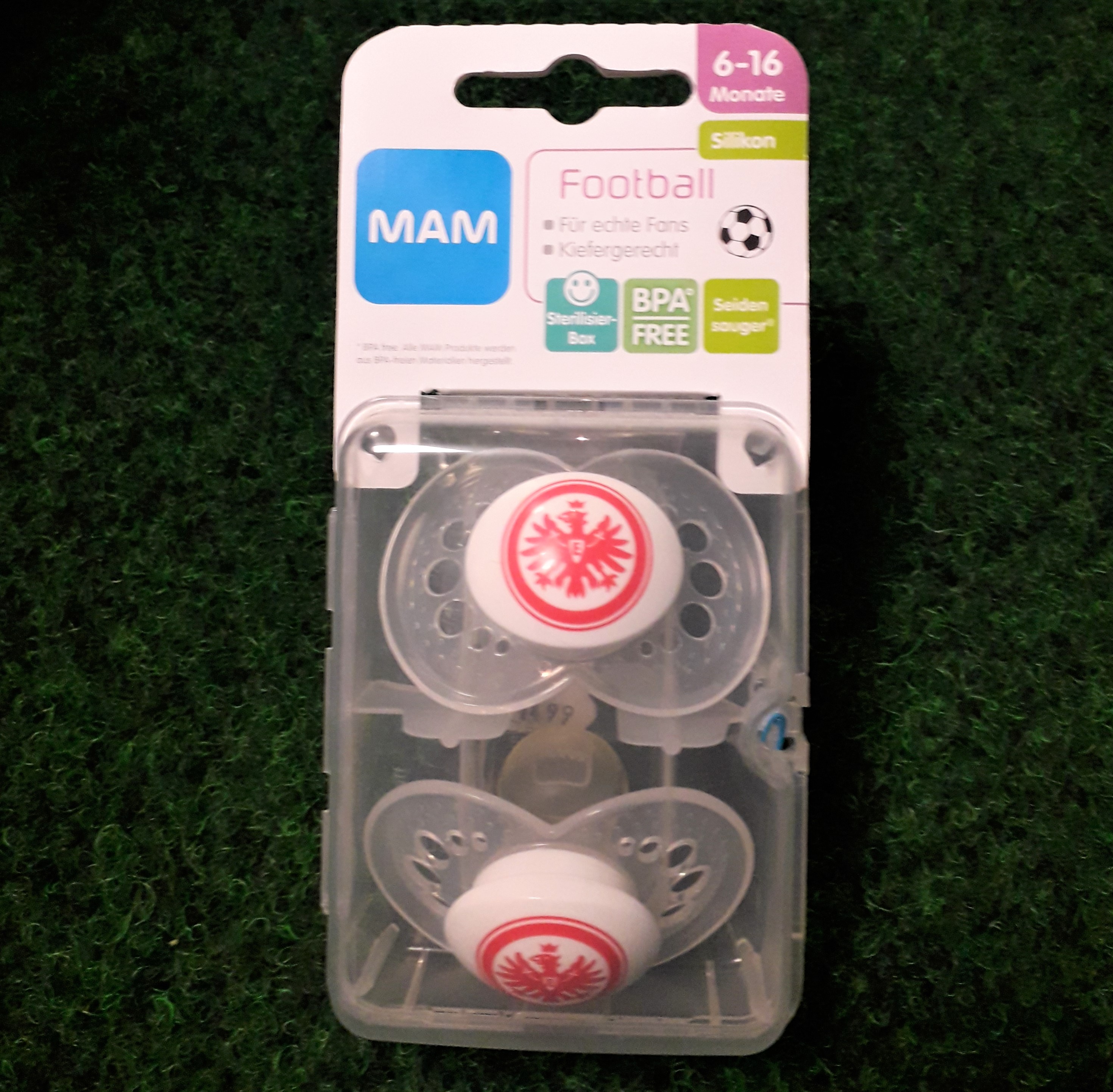 Die MAM Oberfläche und abgerundete Schildränder sind gut für die Haut. 2 Schnuller in wiederverwendbarer Sterilisier- und Transportbox.