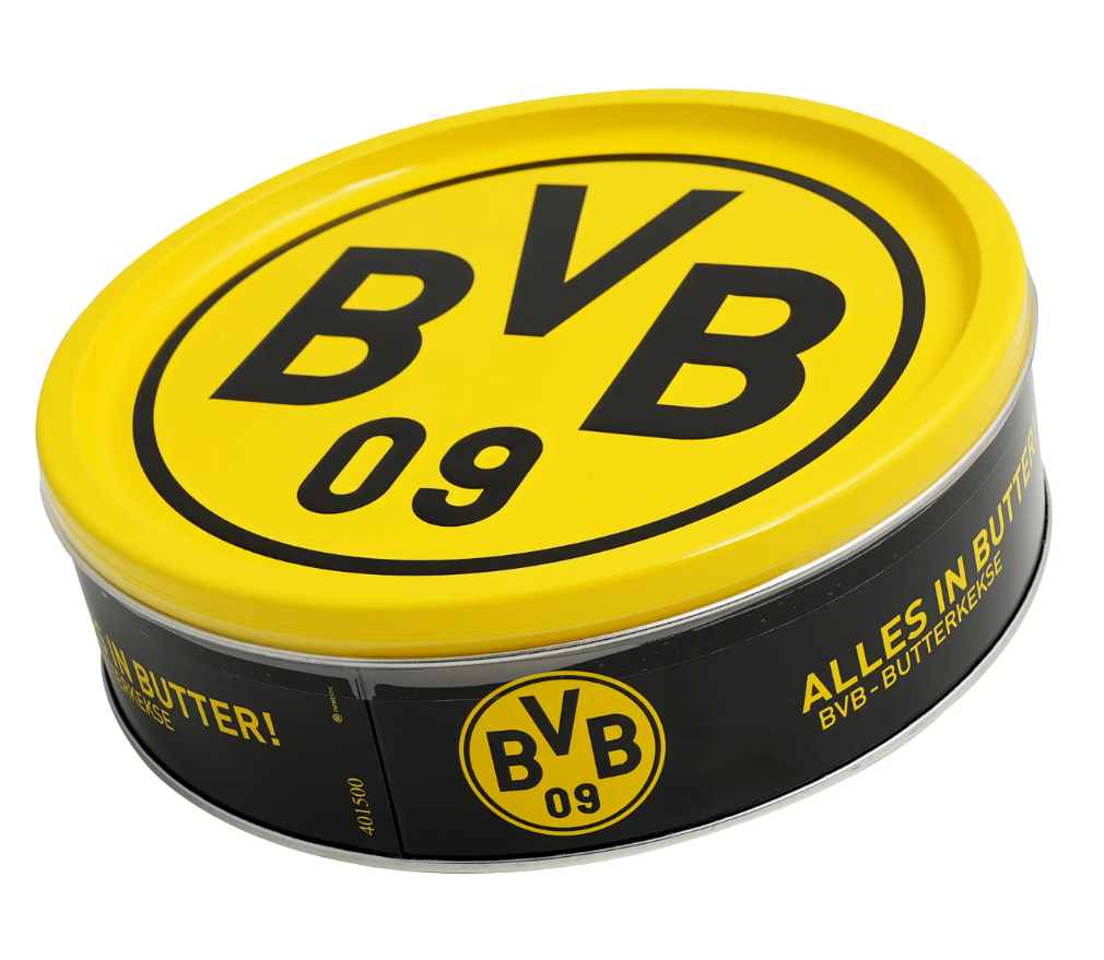Feine Kekse mit besonders hoher Qualität in der wiederverwendbaren Metallbox im BVB Design.