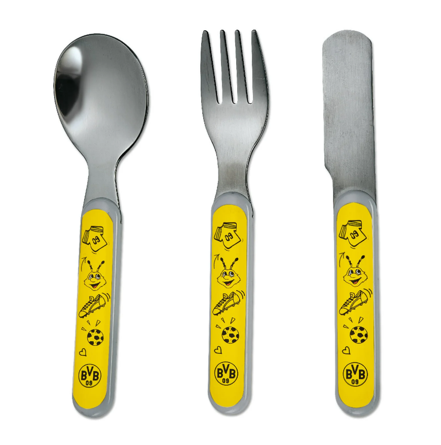 Mit dem 3-teiligen BVB-Kinderbesteckset wird jedes Essen für kleine Borussen zum Festmahl! Das Set besteht aus Gabel, Messer und Löffel aus Metall, die mit einem gelben Kunststoffgriff im BVB Design mit schwarzen Grafiken und unserem Vereinslogo verziert sind. Der BVB wünscht allen kleinen Borussen guten Appetit!