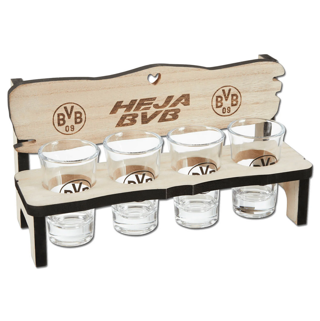 Entdecke unsere neue BVB Pinnchenbank aus Holz. Dieses einzigartige Dekostück ist ein Symbol für Gemeinschaft und Zusammenhalt. Sie beinhaltet vier BVB-Pinnchen mit Logo und ist somit perfekt, um mit Deinen Freunden auf den nächsten Sieg anzustoßen. Das BVB-Logo sowie der Schriftzug „HEJA BVB“ auf der Banklehne zeigt Deine tiefe Verbundenheit zum Verein. Ob im Wohnzimmer oder im Partykeller, diese Pinnchenbank ist ein echter Hingucker und macht das Zusammen Feiern zu einem besonderen Erlebnis.