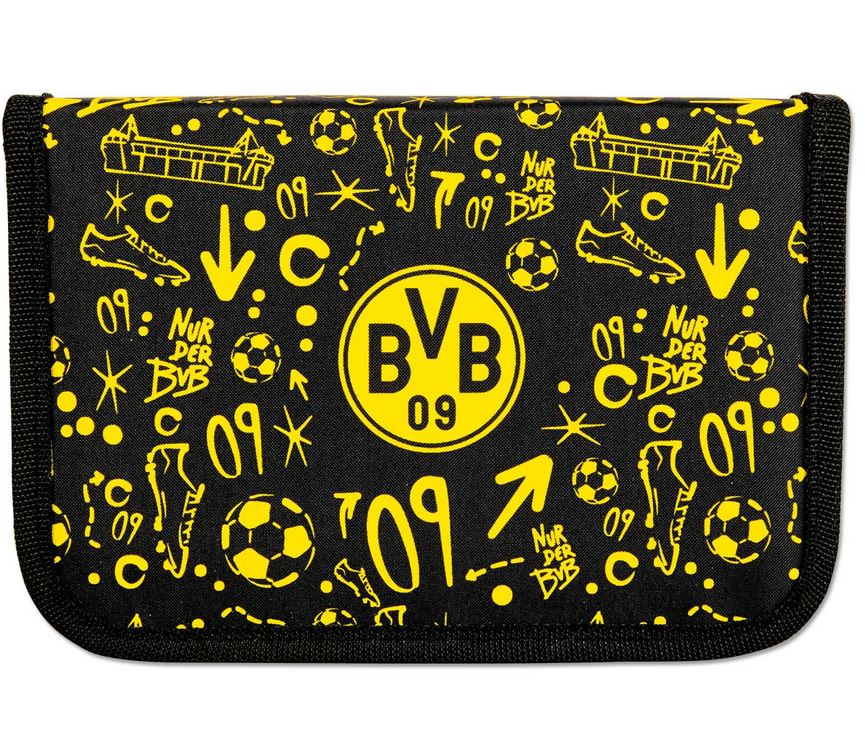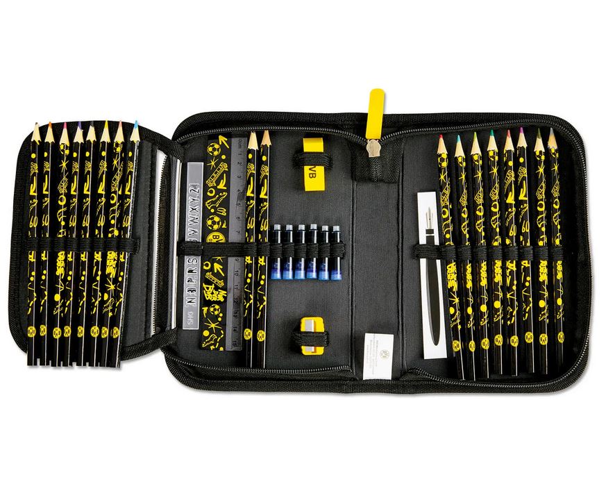 Alles im Griff. Das BVB-Etui ist der ideale Begleiter durch den Schultag. Stifte, Lineal und Radiergummi sind immer griffbereit und alles hat seine Ordnung. Außerdem müsst Ihr es nicht erst befüllen, wir liefern das BVB-Federmäppchen mit umfangreicher Ausstattung. Ein Füller ist nicht enthalten.