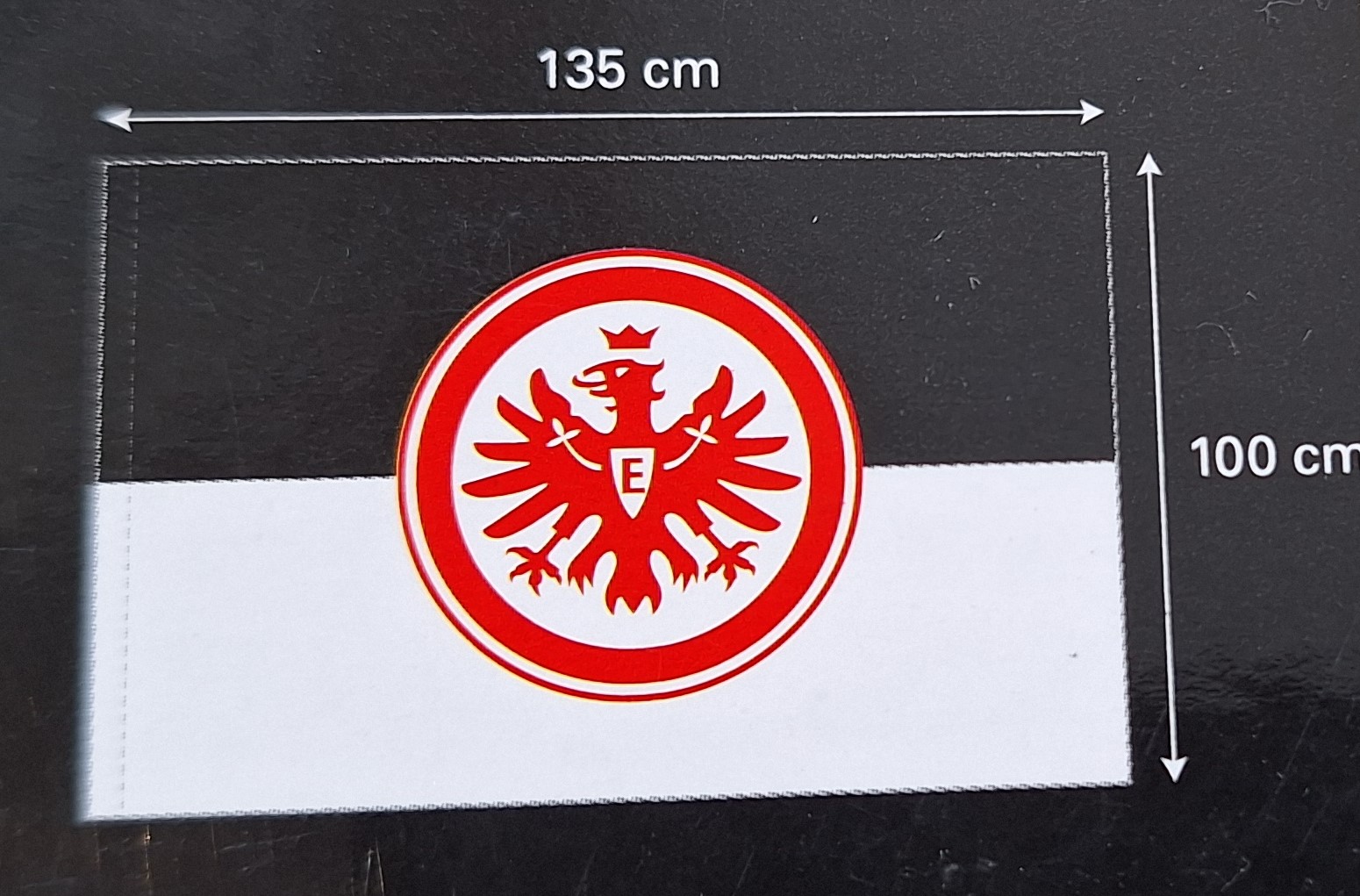 Die klassische Eintracht Fahne hat die Maße 135 x 100 cm, somit kann man diese Fahne perfekt auch als Raumdekoration, Balkonverkleidung nehmen oder im Garten am Fahnenmast aufhängen, wenn die Hißfahnen vielleicht zu groß sind. Schwarz weiße Fahne im Querformat ohne Stock. Dieser kann im Baumarkt oder Holzfachgeschäft (aber bitte nicht im Stadtwald) kostengünstig erworben werden. Die Flagge besteht aus reißfestem Polyester.
