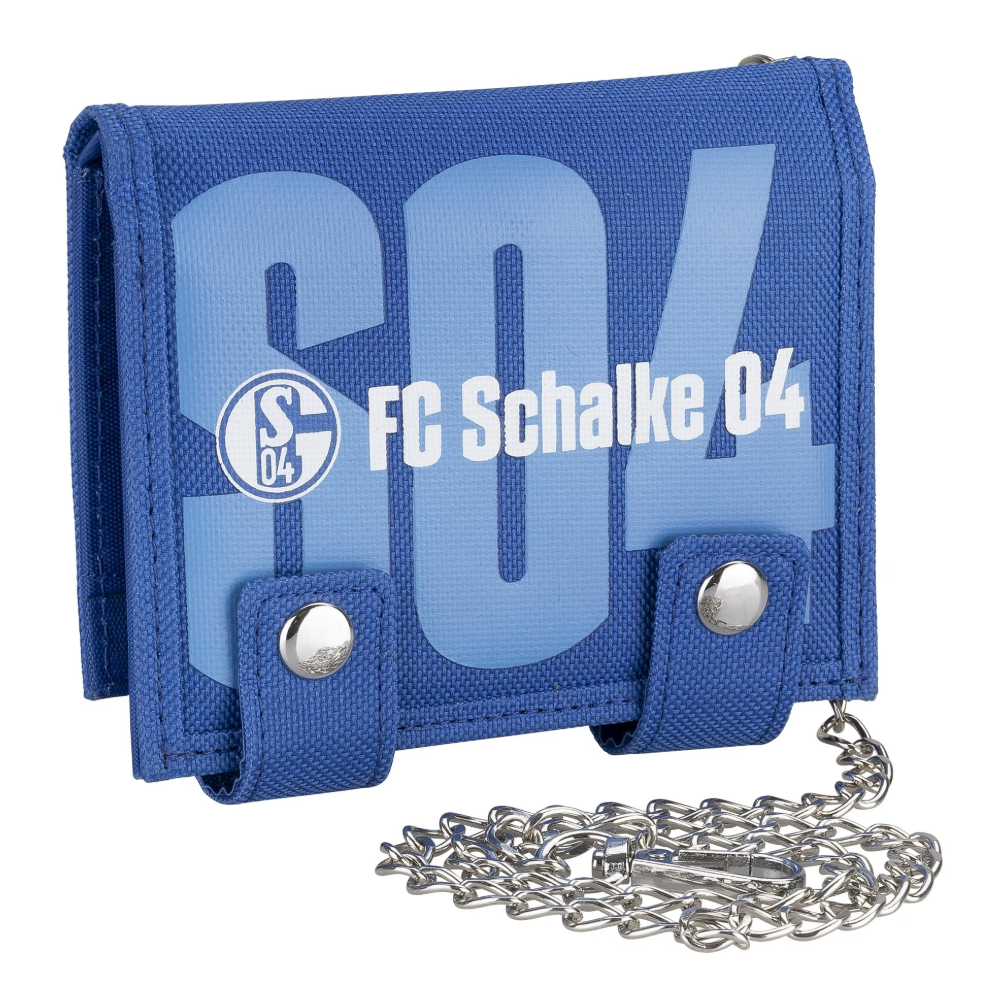 Der doppelte Verschluss und die stillvolle Kette sorgen dafür, dass Dein Geld und Deine Karten stets sicher an Deiner Seite bleiben. Das Design überzeugt durch einen hellblauen S04-Schriftzug im Hintergrund sowie dem S04 Logo und „FC Schalke 04“ Schriftzug im Vordergrund.