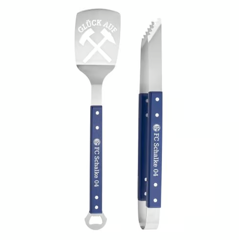 Unser Duo besteht aus einer Grillzange und einem Grillwender, also allem, was Du für Würstchen und Co. so brauchst. Beide bestehen aus Metall und der Griff jeweils aus Kautschuk-Holz, das in königsblau gehalten ist und auf dem in weiß „FC Schalke 04“ steht und unser Vereinslogo prangt. Absolutes Highlight bei dem Grillwender ist aber auf der Wendefläche das ausgestanzte Schlägel-und-Eisen-Motiv und die Aufschrift „Glück Auf“. Damit kann euer Grillgut ja nur gelingen! Für den 2-in-1- Effekt ist am unteren Ende des Grillwenders noch ein Flaschenöffner angebracht.