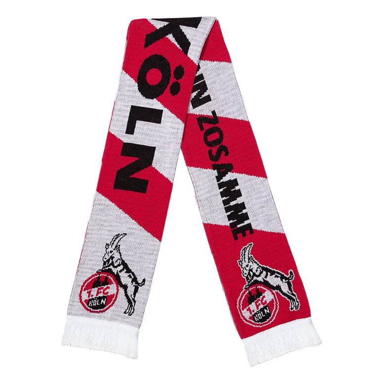 - Schal mit dem kölschen Slogan „Echte Fründe stonn zosamme“ auf der Vorderseite und 1. FC Köln-Schriftzug auf der Rückseite