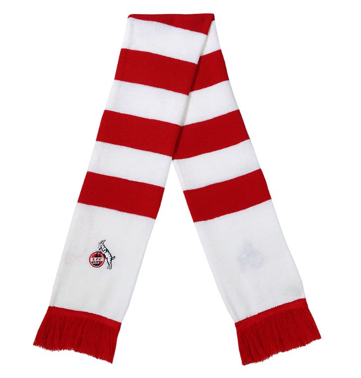 • Dezenter Schal mit rot-weißen Blockstreifen und kleinem FC-Logo-Stick an beiden Enden