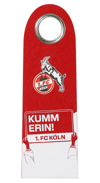 • Eine Seite mit der Botschaft "BLIEV DRUSSE" in roter Karte-Optik, die andere Seite mit "KUMM ERIN" im Stil eines Stadion-Plakats