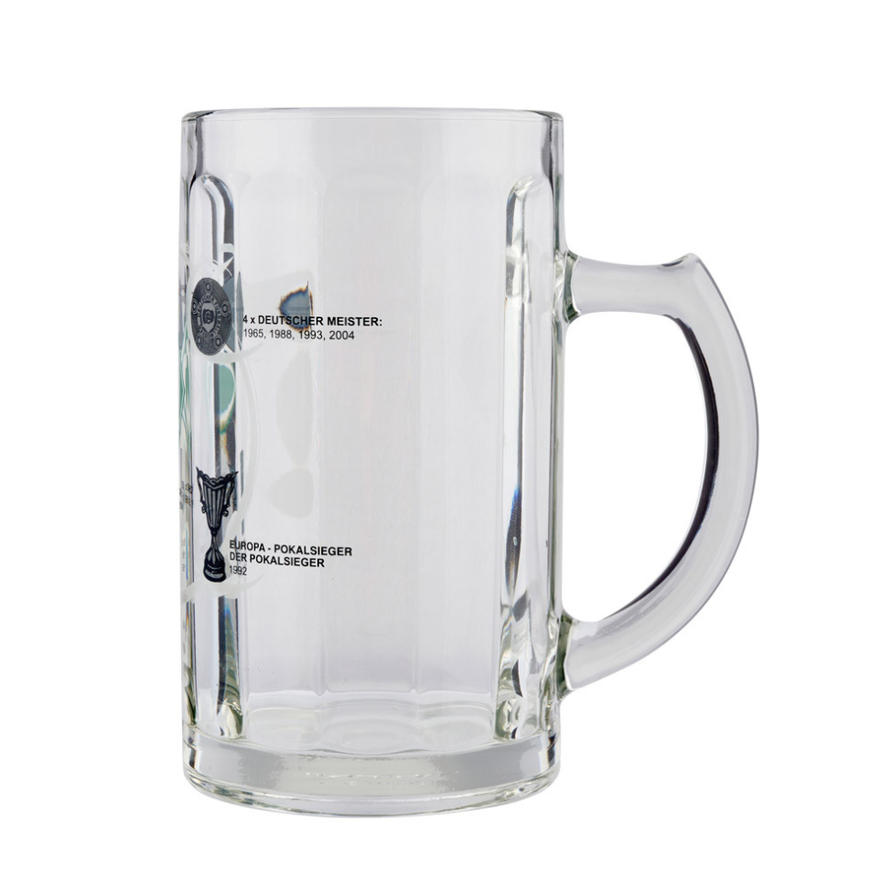 Das vereinsnahe Design zeichnet dieses Werder Accessoire aus. Die Werder-Raute befindet sich auf der Vorderseite und ist natürlich ganz in den Vereinsfarben Grün-Weiß gehalten. Ebenfalls auf dem Bierglas befinden sich ein „Werder Bremen“-Schriftzug sowie alle Titel des SVW. Neben dem gelungenen Design punktet das Bierglas zudem durch seine Spülmaschineneignung. Praktisch und SV Werder Bremen Fan-nah zugleich.