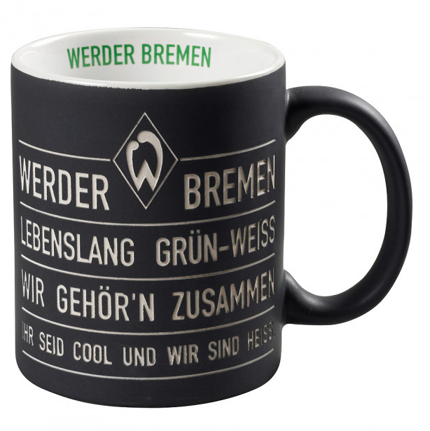 Die schwarze Keramik Tasse ist optimal für den morgendlichen Kaffeegenuss oder Entspannungs-Tee am Abend im Werder Bremen-Stil. So setzt du stilsicher grün-weiße Akzente, ganz einfach, während du dein Lieblingsheißgetränk genießt. Die Tasse ist in einem schlichten Schwarz gehalten, auf der Auszüge aus dem Songtext „Lebenslang Grün-Weiß“ als Sandstrahlgravur eingraviert ist. Die Werder-Raute ist natürlich auch eingraviert und befindet sich ebenfalls an der Außenseite der Tasse. Highlight der SVW Tasse ist der grüne „Werder Bremen“-Schriftzug auf der Innenseite der Tasse. Dieser setzt vereinsverbundene Akzente und fällt aufgrund des weißen Hintergrundes direkt ins Auge. Zudem punktet die Tasse nicht nur durch ihr besonderes Design, sondern auch durch ihre Spülmaschinen- und Mikrowelleneignung. Praktisch und SV Werder Bremen Fan-nah zugleich.